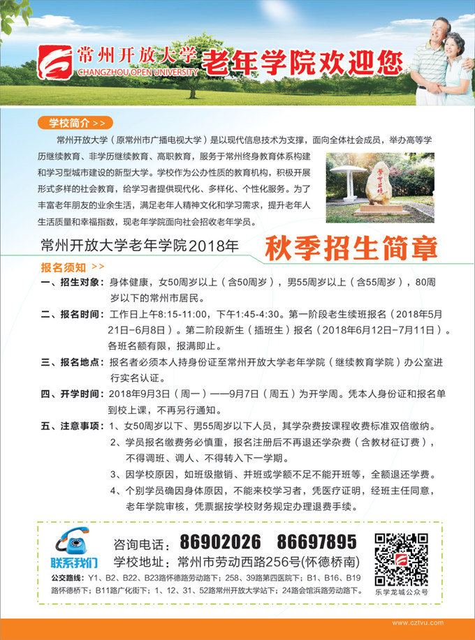 三、报名地点:报名者必须本人持身份证至常州开放大学老年学院(继续教育学院)办公室进行实名认证。