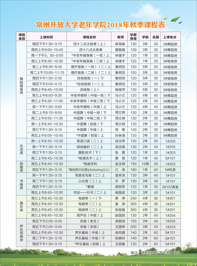 2018年秋季课程详见下表: