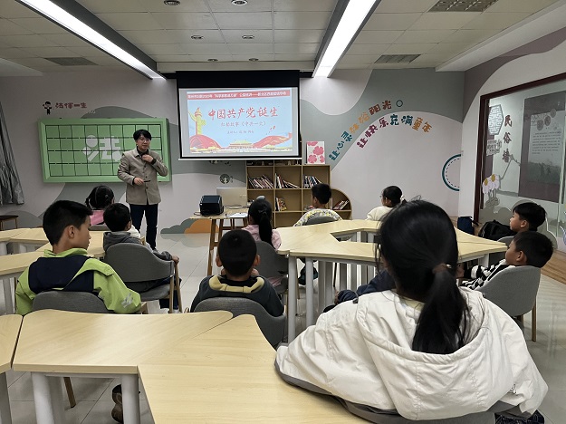 活动伊始,濮扬老师以生动语言、鲜活细节,为孩子们讲述中共“一大”惊险历程与南湖红船壮阔史诗。从代表们冒风险开会,到红船承载民族复兴希望,百年前的历史场景被娓娓道来,让书本文字变得鲜活。孩子们聚精会神,眼眸满是敬仰,信仰之火悄然点燃,爱国情怀与历史责任感潜移默化扎根。